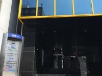 黄色い窓枠がある、地下駐車場への入り口があるビル(DDSビル)です。